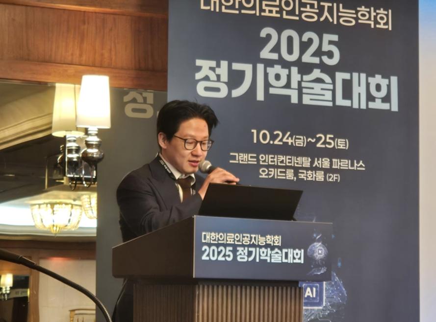 루닛 서범석 대표가 24일 그랜드인터컨티넨탈 서울파르나스에서 열린 의료인공지능학회 학술대회에서 발표하고 있다.