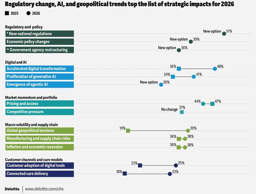 글로벌 컨설팅 기업 딜로이트(Deloitte)는 최근 미국, 유럽, 아시아 지역의 바이오제약 및 의료기기 기업 최고경영진 280명을 대상으로 '2026 생명과학 전망 조사' 결과를 발표했다.
