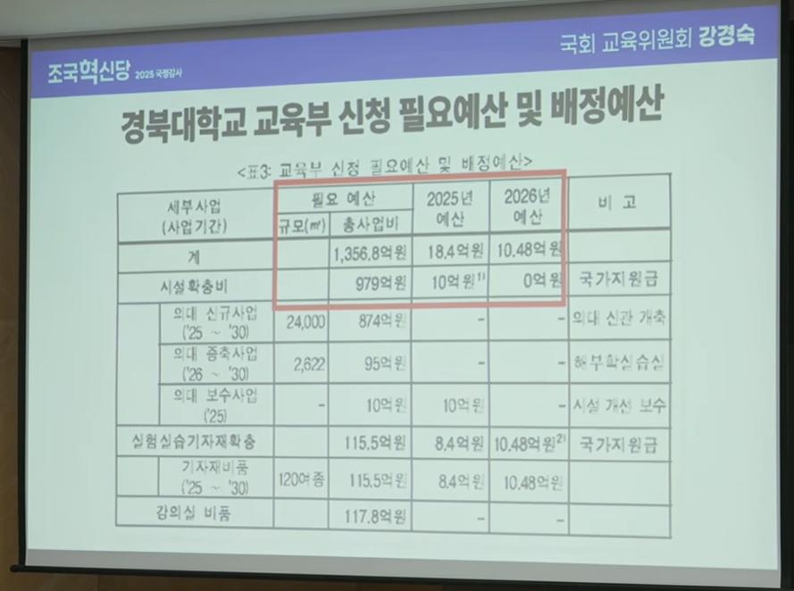 국회 교육위원회 강경숙 의원(조국혁신당)은 22일 교육위 국정감사에서 "지난해 홍원화 전 경북대 총장은 의료 교육을 위해 시설 확충 979억원, 기가제 확충 115억원 등 1357억원을 확보했다고 했다"며 "그러나 올해 예산을 확인해 보니 18억4000만원에 불과했고 내년 예산도 10억원 정도 그친다"고 지적했다.
