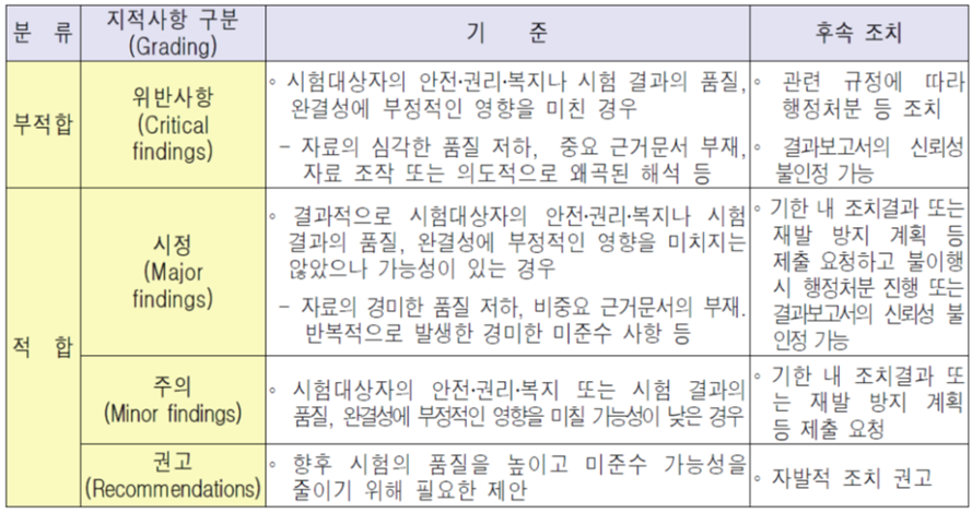 점검이나 실태조사를 통해 환자의 안전, 자료의 신뢰성 및 규정 준수에 미치는 실제적인 또는 잠재적인 품질 이슈(quality issue)가 발견되면 지적사항을 바탕으로 시정과 재발방지 계획을 세워야 한다. 지적사항의 분류는 식약처 임상시험 실태조사 기본계획에서 제시한 분류(아래 표)를 참고한다.(5) 점검과 실태조사의 시행 주체 및 대상 업무에 따라 평가 기준은 상이할 수 있으나 지적사항의 분류는 대체로 유사하다.