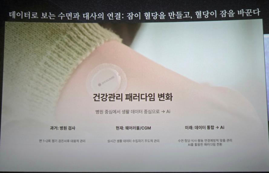 이에 그는 수면, 혈당, 식사, 운동 데이터를 유기적으로 연결해 개인 맞춤형 건강관리 서비스를 제공하는 것이 목표라고 밝혔다.