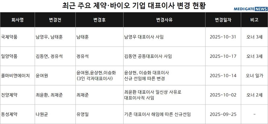 국제약품·일양약품·진양제약 등 세대교체 속 단독체제 전환…콜마비앤에이치·동성제약 경영권분쟁으로 재편