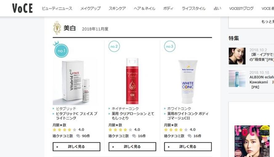 일본 3대 미용잡지 중 하나인 'VoCE'가 지난 10월 한달간 소비자 후기건수와 추천도, 페이지뷰 등을 기반으로 집계한 '11월 월간 베스트 코스메틱'에서 '비타브리드C12 페이스 브라이트닝'이 미백부문 1위, 주름-탄력부문 3위에 선정된 것이다.
