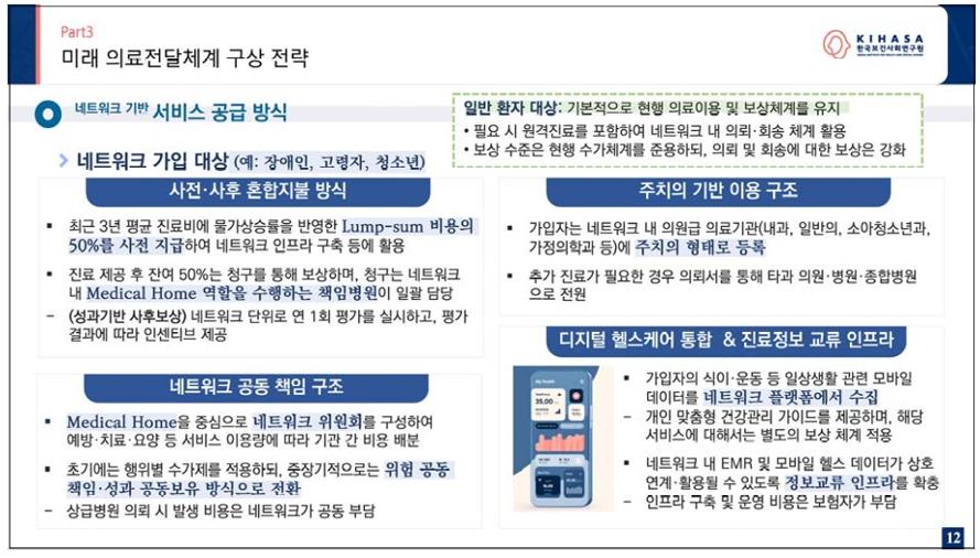 신 원장은 "일반인은 네트워크에 가입하거나 현행처럼 자유롭게 이용할 수 있게 하되 장애인, 65세 이상 고령인, 청소년은 네트워크에 의무가입하는 형태"라며 "네트워크 내에서 서비스를 이용하되 필요시 의뢰서 발급에 의해 상급병원 이용이 가능하다. 또한 네트워크 가입자에 대해선 보장성을 높이거나 확대된 건강검진 기회 등 인센티브를 제공해 가입을 유도하는 방식을 고려할 수 있다"고 덧붙였다.