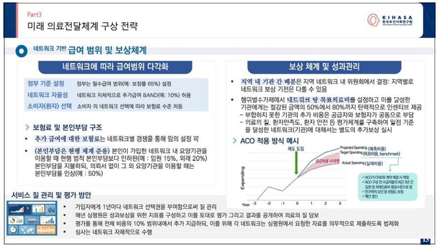 그는 "행위별수가제에서 네트워크 당 목표의료비를 설정하고 이를 달성한 기관에겐 절감된 금액의 50%에서 80%까지 탄력적으로 인센티브를 제공할 수 있다"며 "부합하지 못한 기관의 추가 비용은 공급자와 보험자가 공동으로 부담할 수 있다. 또한 의료의 질, 환자만족도, 환자 안전 등 평가체계를 구축해 일정 기준을 달성한 네트워크에 대해선 별도 추가보상을 실시한다"고 설명했다.