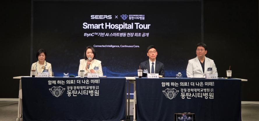 웨어러블 AI 진단모니터링 기업 씨어스는 15일 동탄시티병원에서 'Smart Hospital Media Tour'를 개최하고 AI 기반 병상 모니터링 시스템 '씽크(thynC)'의 운영 현장을 공개했다.