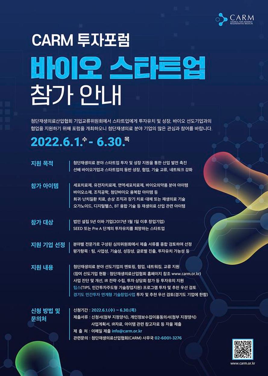 첨단재생의료산업협회(CARM)가 바이오 스타트업에 투자유치 및 성장, 바이오 선도 기업과의 협업을 지원하기 위해 ‘CARM 투자포럼’ 참여 기업을 모집한다고 30일 밝혔다.