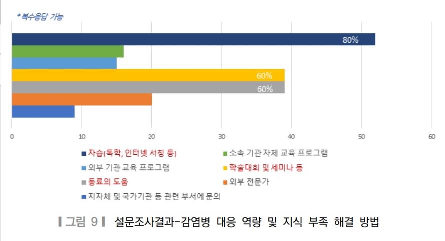 이에 의료인들은 지식 부족과 감염병 대응 역량 문제를 해결하기 위해 80%가 독학으로 학습을 이어가고 있는 것으로 나타났고 동료의 도움이나 학술대회 등을 통해 자발적으로 대응하고 있는 비율도 60%나 됐다.