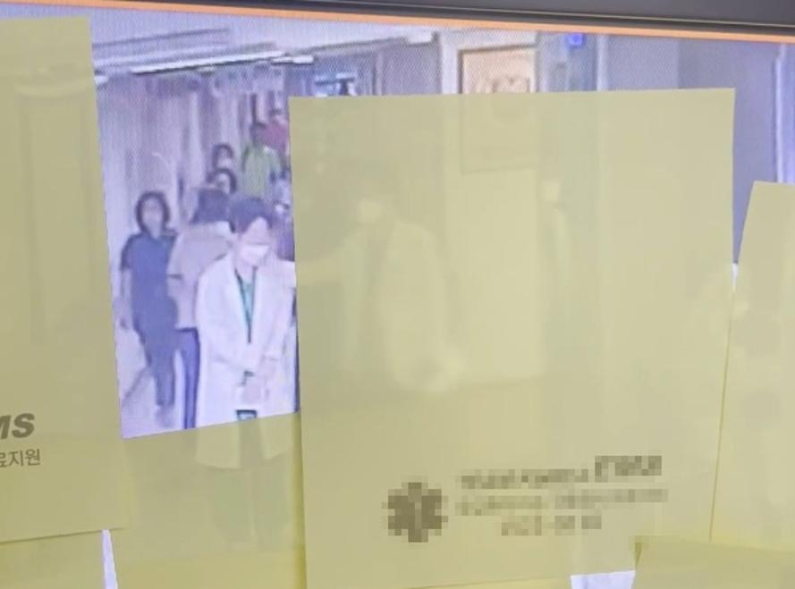 B교수가 병원 복도에서 A씨의 복부를 때리고 얼굴을 밀치는 장면이 담긴 CCTV 영상.