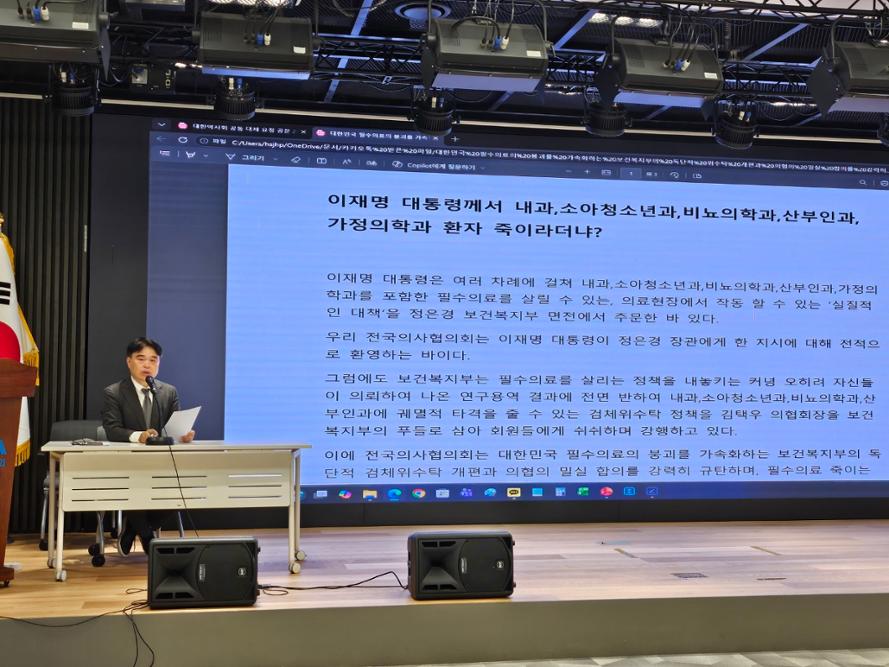 대한의사협회에 대해 임 회장은 "의협 김택우 집행부는 복지부 하수인 역할을 자처해 필수의료 과목들을 사지로 몰아넣는 위수탁 개편안을 쉬쉬하며 일사천리로 수용하려 하고 있다"고 지적했다.