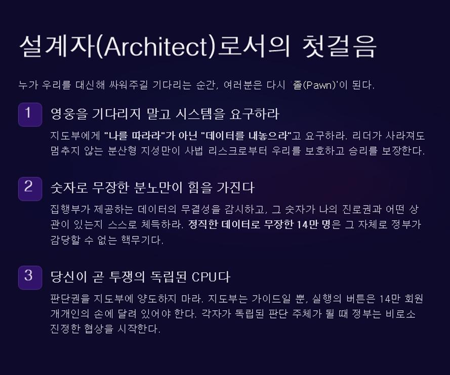 그는 "단순한 구호나 감정적 저항만으로는 협상이 성립하지 않는다"며 "내부 결속을 만드는 숫자, 사회적 명분, 조직의 구조, 상대를 두렵게 하는 기세가 함께 있어야 한다"며 의사 집단행동 실패 원인을 분석했다.