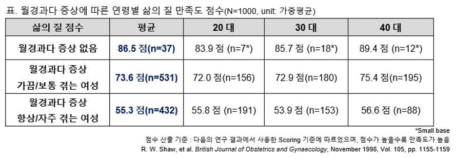 해당 조사에서 월경과다 증상을 항상/자주 겪는 여성의 삶의 질 점수는 100점 만점 기준, 20대 55.8점, 30대 53.9점, 40대 56.6점으로, 월경과다 증상이 없는 여성과 비교했을 때 전체적으로 30점 정도 낮았다. 월경과다 증상을 가끔/보통 겪는 여성의 삶의 질 평균 점수(73.6점)과 비교했을 때도 한참 떨어진다.