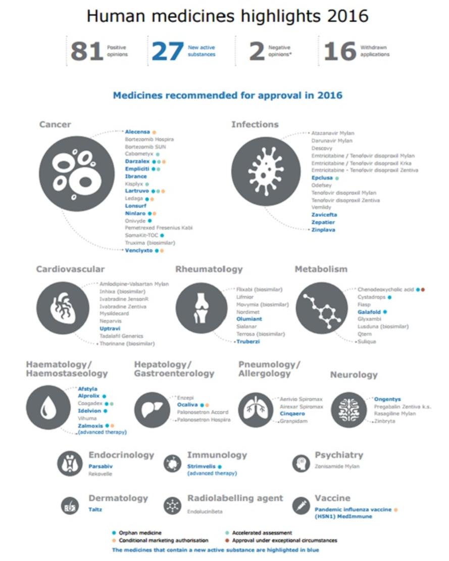 마케팅 허가를 권고한 81종의 의약품(27종의 신 활성물질 포함)은 '의약품 하이라이트 2016'(아래 그림)에서 확인할 수 있다.