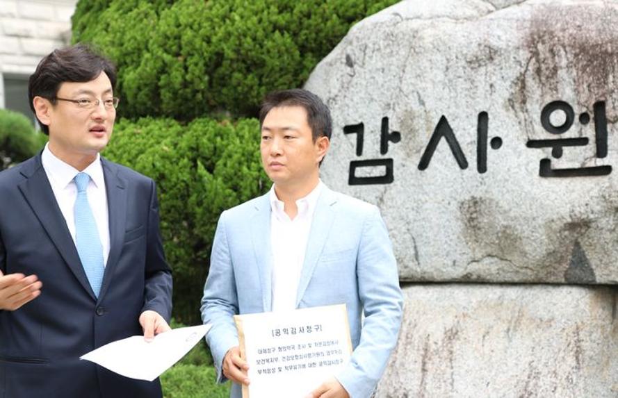 의원협회 윤용선(왼쪽) 회장과 전의총 나경섭 공동대표가 7월 23일 감사원에 공익감사청구서를 제출하는 모습