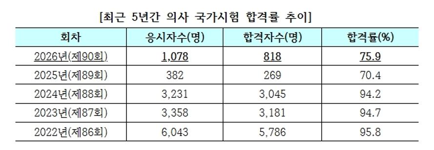합격률도 지난해에 비해선 소폭 증가했지만, 예년 수준에는 크게 못 미쳤다. 의사국시 합격률은 지난 86~88회 경우 합격률이 90% 중반대를 기록하다가, 의정갈등의 영향으로 응시자 수가 크게 줄었던 89회에 70.4%로 떨어졌다.