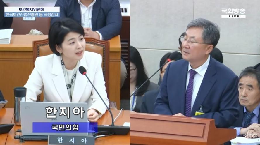 국민의힘 한지아 의원, 국립중앙의료원 서길준 의료원장. 사진=국회방송 중계 영상 갈무리