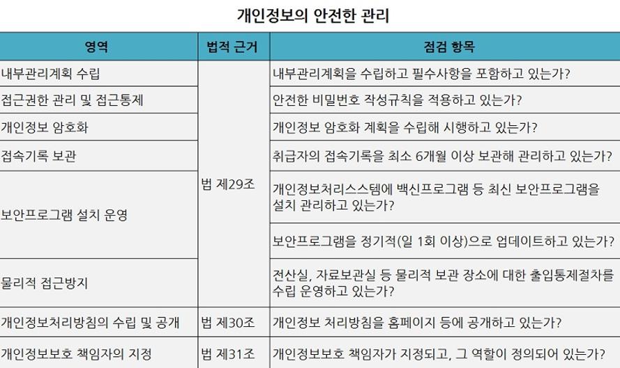 '개인정보의 처리 제한' 분야에서는 개인정보 처리 업체에 위탁할 때의 계약서 작성, 개인정보 담당 직원에게 보안서약서를 받는 등 실제적인 부분을 점검한다.