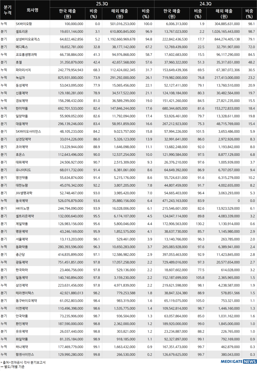 전체 매출에서 해외 매출 비중이 50%를 넘는 기업은 SK바이오팜, 셀트리온, 삼성바이오로직스, 메디톡스, 코오롱생명과학, 휴젤 등으로, 신약·CDMO·보툴리눔 톡신 중심 기업이 주를 이뤘다. 파마리서치는 해외 비중 37.1%로 휴젤 뒤를 이었다.