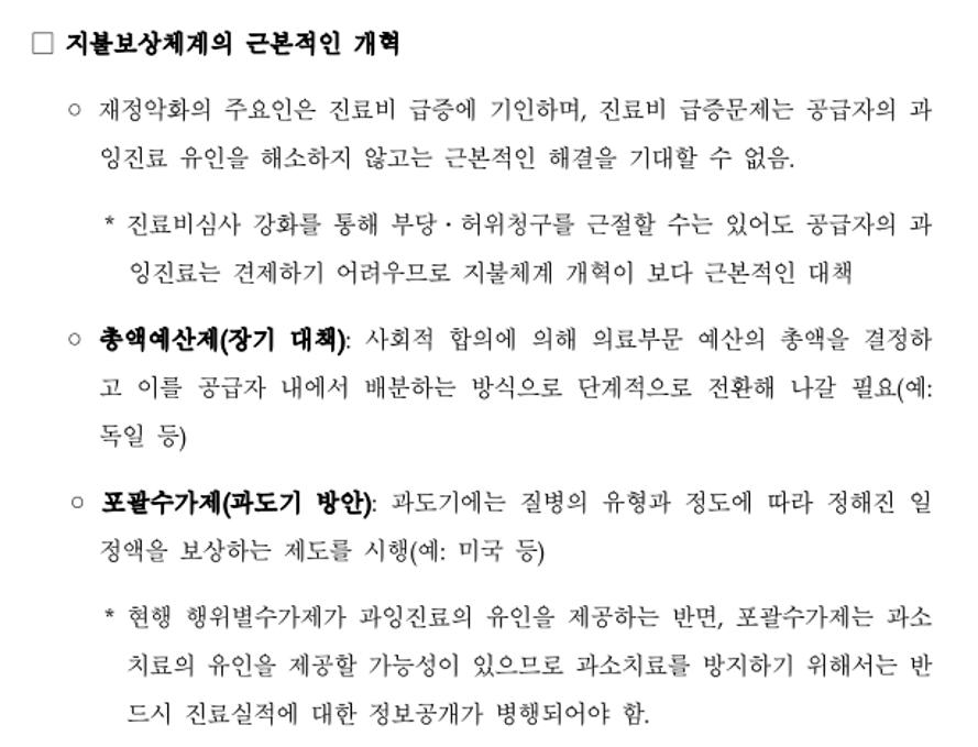 이어 총액예산제로 넘어가기 전 과도기 방안으로는 “질병의 유형과 정도에 따라 정해진 일정액을 보상하는 제도를 시행해야 한다”며 포괄수가제를 언급했다.
