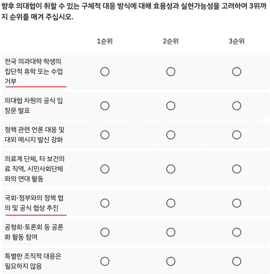 구체적으로 설문은 '의대 학생 사회가 현안에 대해 대응할 수 있는 방식으로 가장 적절한 방법은 무엇인가'라는 질의와 관련해 ▲적극적인 집단 행동 중심 대응 ▲정책 협의 및 대정부 협상 중심 대응 ▲공론화 및 여론 형성 중심 대응 등을 보기로 제시했다.