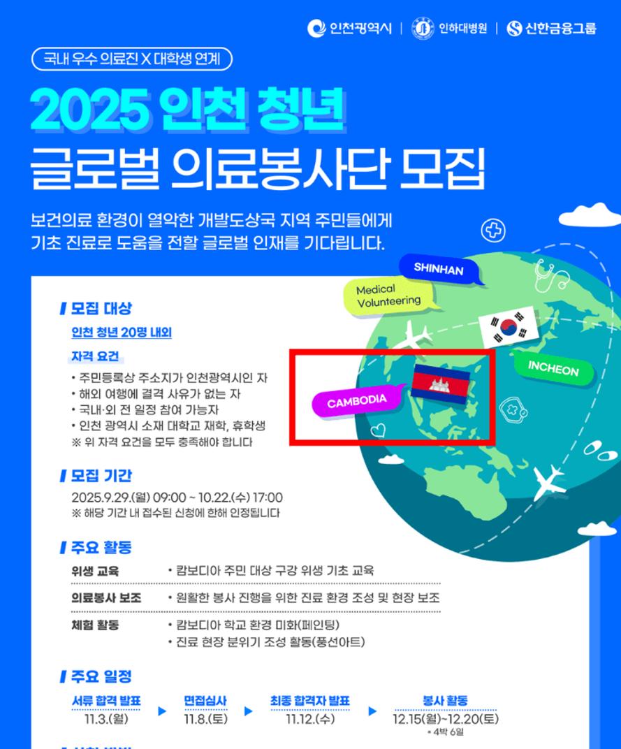 인천시는 인하대병원 의료진과 함께 의료 관련 전공 대학생들을 모집해 캄보디아 올해 12월 의료봉사를 떠날 계획이었다.