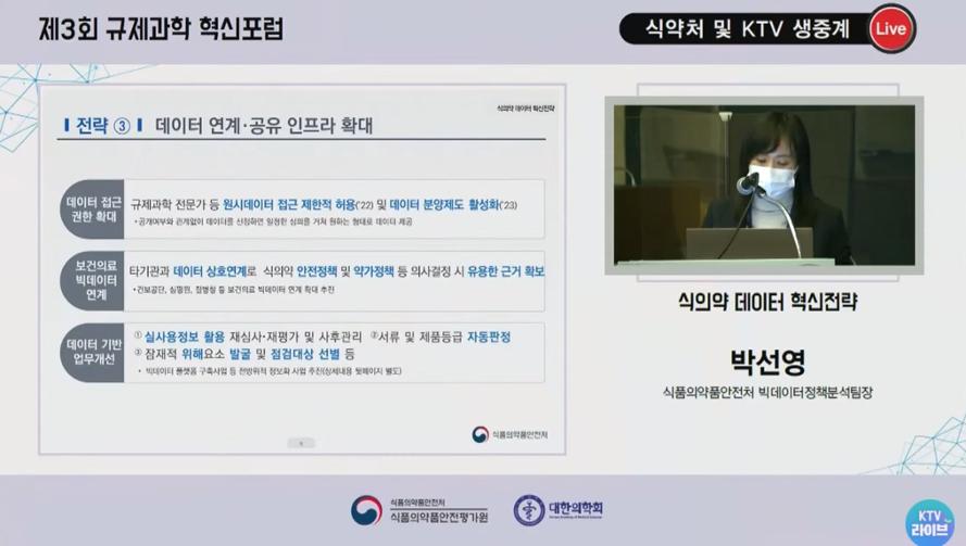 식약처도 데이터 활용의 중요성을 인지하고, 혁신전략을 수립·추진한다. 사진 = 식약처 빅데이터정책분석팀 박선영 과장 제3회 규제과학 혁신포럼 갈무리.