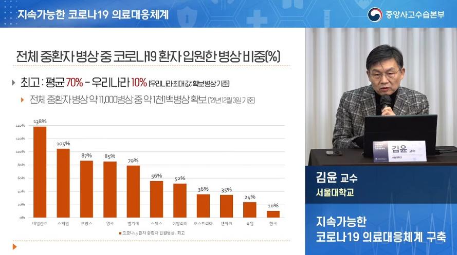 실제 김 교수에 따르면 주요 국가들에서 전체 중환자 병상 중 코로나 환자가 입원한 병상 비중이 최고치에 달했을 때 평균 수치가 70%에 달했지만, 우리나라는 10%에 불과한 것으로 나타났다.