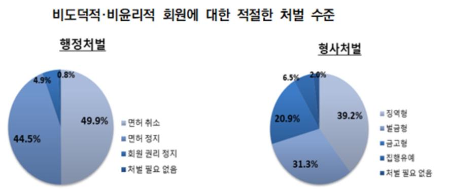 조사결과, ‘비도덕적·비윤리적 행위를 한 회원에 대한 적절한 행정처벌 수준은 무엇인지' 묻는 질의에 면허취소(49.9%) 라고 대답한 회원이 가장 많았다.