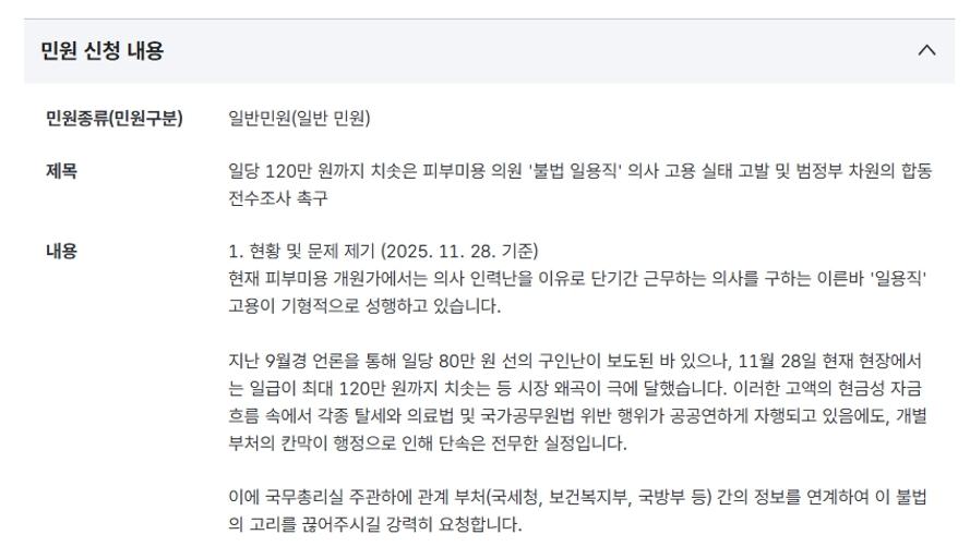 A씨는 민원 글에서 "현재 피부미용 개원가에서는 의사 인력난을 이유로 단기간 근무하는 의사를 구하는 이른바 '일용직' 고용이 기형적으로 성행하고 있다. 지난 9월엔 일단 80만원 선이었던 일급이 최근 최대 120만원까지 최솟는 등 시장 왜곡이 극에 달했다. 이런 고액의 현금성 자금 흐름 속에서 각종 탈세와 의료법 및 국가공무원법 위반 행위가 공공연하게 자행되고 있음에도, 개별 부처의 칸막이 행정으로 인해 단속은 전무한 실정"이라고 지적했다.