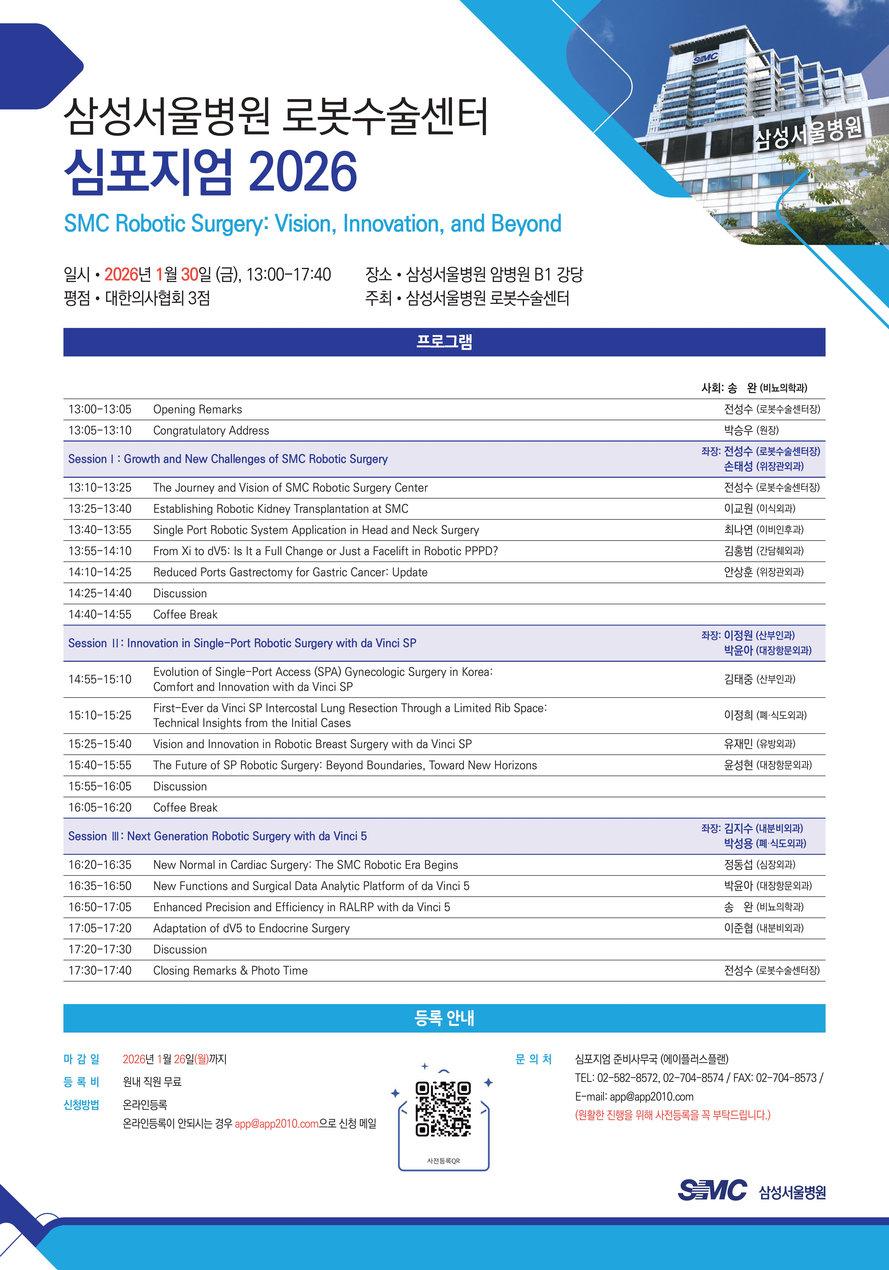 삼성서울병원 로봇수술센터는 오는 30일 오후 1시부터 삼성서울병원 암병원 지하 1층 강당에서 ‘삼성서울병원 로봇수술센터 심포지엄 2026’을 개최한다고 밝혔다.