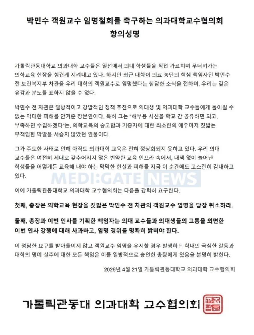 가톨릭관동대 의과대학 교수협의회는 21일 성명을 통해 "가톨릭관동의대 교수들은 일선에서 의대 학생들을 직접 가르치며 무너져가는 의학교육 현장을 힘겹게 지켜내고 있다"며 "하지만 최근 대학이 의료 농단의 핵심 책임자인 박민수 전 차관을 객원교수로 임명했다는 참담한 소식을 접했다. 깊은 유감과 분노를 표하지 않을 수 없다"고 비판했다.