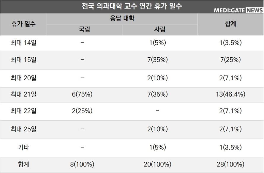 의과대학 중 교수들의 연차가 가장 적은 곳은 14일이었고, 가장 많은 곳은 25일이었다. 사립대에 비해서는 국립대 의대 교수들의 연차가 더 많았다.