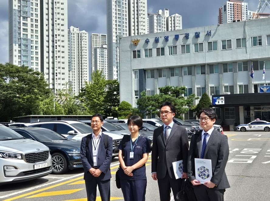 아주대병원 외상외과 김진주 교수(왼쪽에서 두 번째), 성남시의사회 김경태 회장(오른쪽에서 두 번째)이 지난해 8월29일 조사를 받기 위해 수원영통경찰서를 찾은 모습.