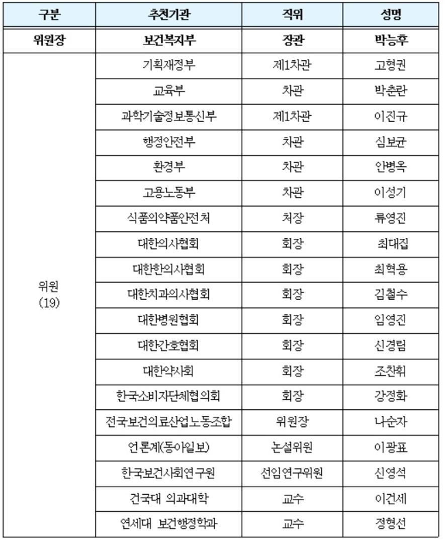 한편, 보정심 위원은 복지부 박능후 장관을 위원장으로 기획재정부 고형권 제1차관, 교육부 박춘란 차관, 과학기술정보통신부 이진규 제1차관, 행정안전부 심보균 차관, 환경부 안병옥 차관, 고용노동부 이성기 차관, 식품의약품안전처 류영진 처장 등이 참여한다. 또 대한의사협회 최대집 회장, 대한한의사협회 최혁용 회장, 대한치과의사협회 김철수 회장, 대한병원협회 임영진 회장, 대한간호협회 신경림 회장, 대한약사회 조찬휘 회장, 한국소비자단체협의회 강정화 회장, 전국보건의료산업노동조합 나순자 위원장, 언론계(동아일보) 이광표 논설위원, 한국보건사회연구원 신영석 선임연구위원, 건국대 의과대학 이건세 교수, 연세대 보건행정학과 정형선 교수 등이다.