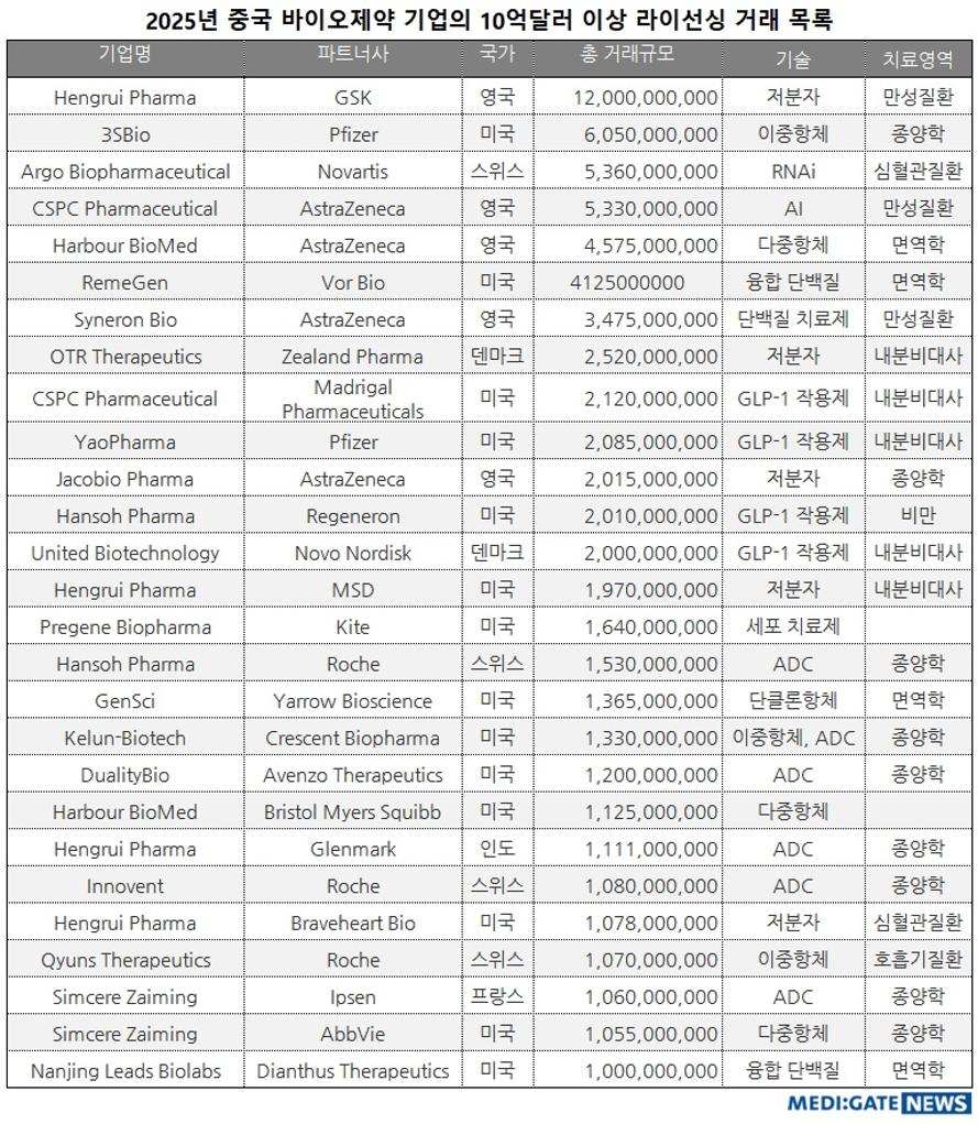 아스트라제네카(AstraZeneca)와 로슈(Roche), MSD(Merck & Co), 화이자(Pfizer), 애브비(AbbVie), BMS(Bristol Myers Squibb), GSK(GlaxoSmithKline), 릴리(Eli Lilly and Company), 노바티스(Novartis), 노보 노디스크(Novo Nordisk), 사노피(Sanofi), 다케다(Takeda) 등 글로벌 상위권 제약회사 대부분이 중국 기업으로부터 기술을 도입했다.