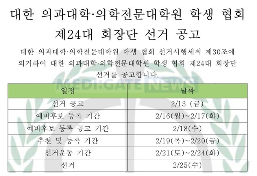 한편, 이번 의대협 회장 선거의 예비 후보등록기간은 16일부터 17일까지이며, 19~20일 추천 및 등록 기간을 거쳐 21일부터 24일까지 나흘간 선거운동이 진행된다. 선거는 25일로 예정돼 있으며 각 학교 학생 대표들이 투표하는 간선제 방식이다.