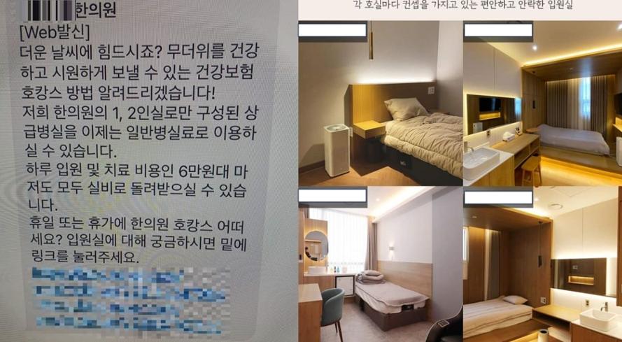 12일 의료계에 따르면 A 한의원은 최근 내원객들을 대상으로 “무더위를 건강하고 시원하게 보낼 수 있는 건강보험 호캉스 방법을 알려드리겠다”며 “우리 한의원의 1, 2인실로만 구성된 상급병실을 이제는 일반 병실료로 이용할 수 있다. 하루 입원 및 치료비용인 6만원도 모두 실비로 돌려받을 수 있다”는 문자를 보냈다.