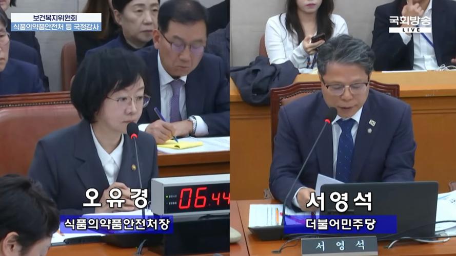 (왼쪽부터) 식품의약품안전처 오유경 처장, 더불어민주당 서영석 의원. 사진=국회방송