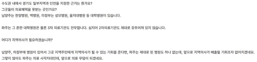 B씨는 "남양주, 의정부에 병원이 있어서 그곳 지역 주민에게 지역의사가 될 수 있는 기회를 준다면, 파주는 제대로 된 병원도 하나 없는데, 앞으로 지역의사가 배출될 기회조차 없어졌다. 그렇지 않아도 파주는 의료 사각지대인데, 앞으로 의료 무덤이 될 것"이라고 강조했다.