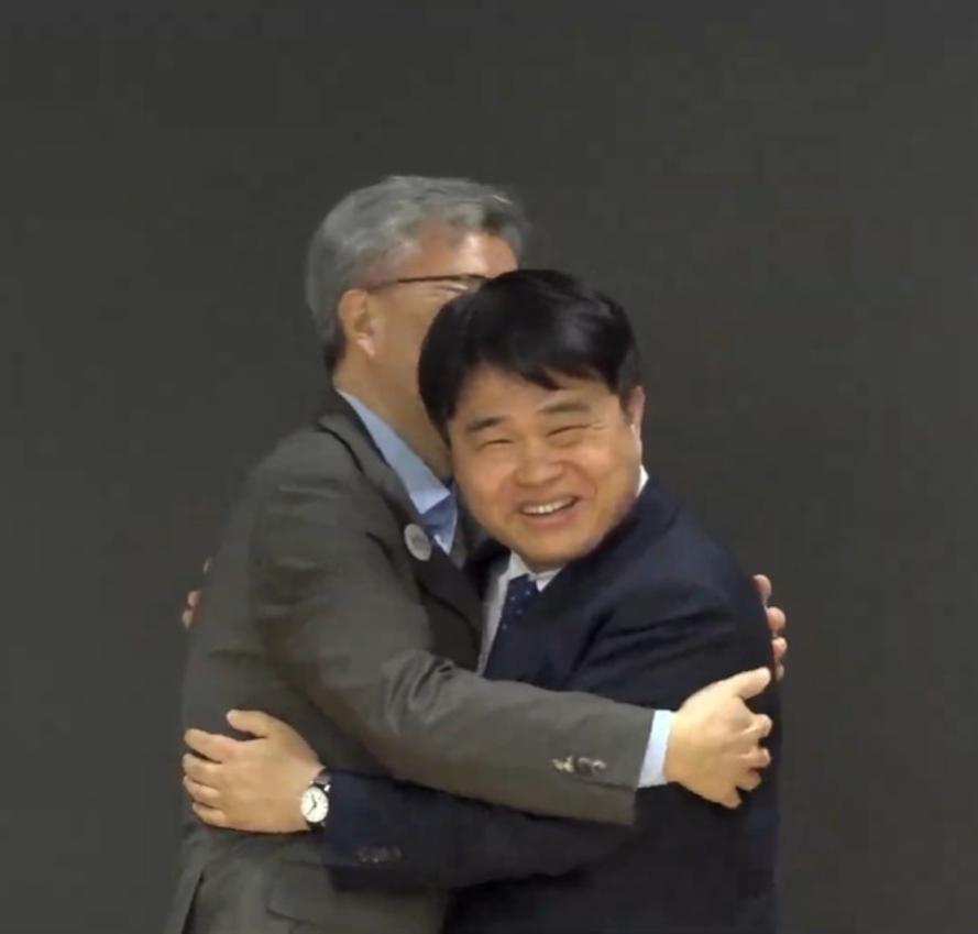 포옹을 하고 있는 대한의사협회 임현택 회장 당선인과 김택우 비상대책위원장. 사진=KMA TV 실시간 생중계 갈무리