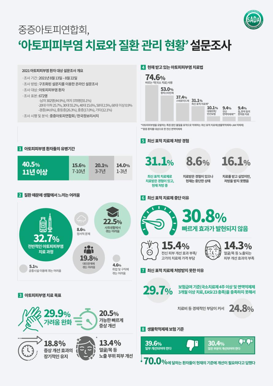 침, 한약 등의 한의원 치료 및 대체의학/민간요법 등을 사용한다는 환자도 각기 9.4%, 10.1%에 달해, 표준요법 이외의 치료에 대한 의존도가 아직까지도 높다는 점을 보여줬다. 치료법에 대한 만족도는 생물학적제제가 3.83점(5점 만점)으로 가장 높았고, 바르는 약(3.67점), 항히스타민제/스테로이드제(3.50점), 광선 치료(3.30점)에 대한 만족도가 타 치료법 대비 상대적으로 높게 나타났다. 반면, 전신 면역억제제(2.98점), 대체의학/민간요법(2.91점)은 상대적으로 낮은 만족도를 보였다.