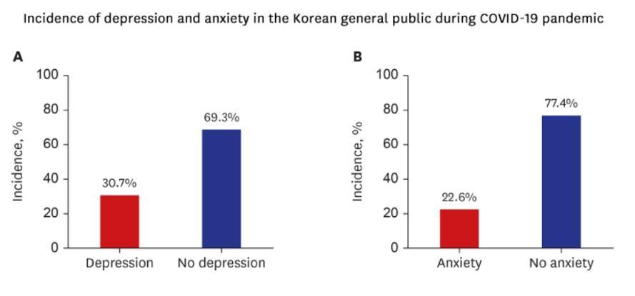 지난 7월 26일 부산동아대병원 김동민 교수 연구팀이 대한의학회지(JKMS)에 발표한 연구에 따르면 설문에 참여한 2288명 중 30.7%의 우울증을, 22.6%는 불안 증세를 보였다.