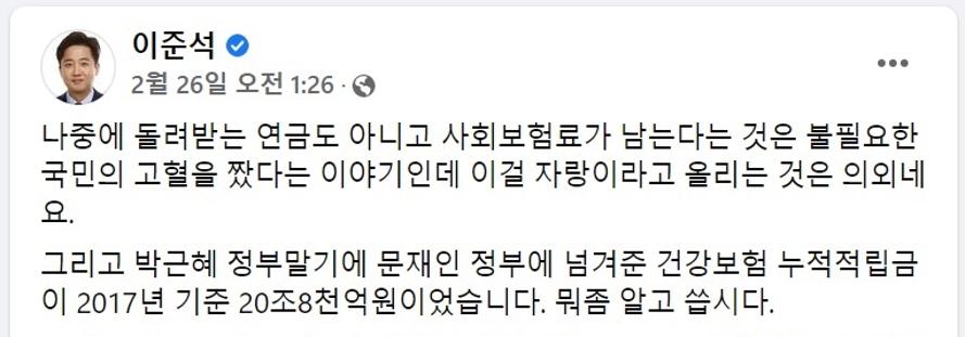 국민의힘 이준석 대표는 26일 페이스북을 통해 "나중에 돌려받는 연금도 아니고 사회보험료가 남는다는 것은 불필요한 국민의 고혈을 짰다는 얘기"라며 "박근혜 정부 말기에 문재인 정부에 넘겨준 건강보험 누적적립금이 2017년 기준 20조8000억원이었다. 뭐좀 알고 쓰자"고 지적했다.