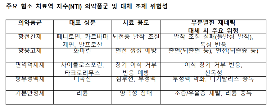 2. 심각한 임상적 위험: 모든 제네릭 의약품이 환자에게 동일한 효과를 나타낸다는 가정은 위험한 착각이다. 특히 혈중 농도의 미세한 차이가 심각한 부작용으로 이어질 수 있는 '협소 치료역 지수(NTI)' 의약품의 경우 무분별한 대체 조제는 치명적일 수 있다. 와파린(항응고제), 카르바마제핀(항전간제), 사이클로스포린(면역억제제) 등이 여기에 해당하며, 약국의 재고 사정에 따라 약이 무작위로 변경될 경우 발작, 장기 거부 반응, 심각한 출혈 등으로 이어질 수 있다. 이는 환자 안전을 담보로 한 위험한 도박이다.