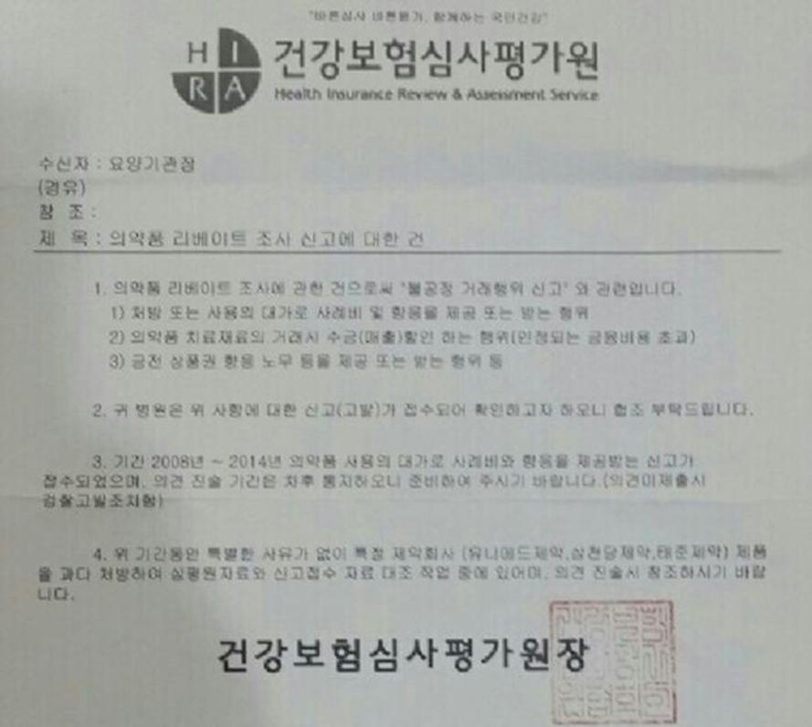 또 공문에는 '2008년부터 2014년까지 의약품 사용의 대가로 사례비와 향응을 제공 받았다는 신고가 접수되었으며, 의견진술 기간은 추후 통지하오니 준비해 주시기 바란다. 의견미제출시 검찰고발 조치 함' 이라고 명시했다.