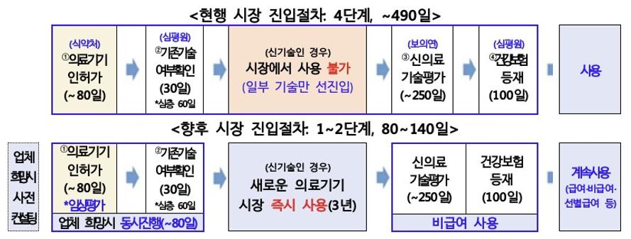 이에 복지부와 식약처는 의료기기 허가 단계에서 국제적 수준의 강화된 임상평가를 거친 새로운 의료기기를 활용하는 의료기술은 별도의 신의료기술평가 없이 시장에 즉시 진입해 사용할 수 있도록 하는 제도를 마련했다.