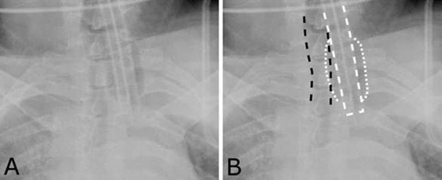 식도삽관(Esophageal Intubation)된 소아의 X-ray 사진 예 <출처: chestxray.hpage.co.in>