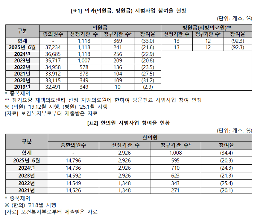 9일 국회 보건복지위원회 박희승 의원(더불어민주당, 남원장수임실순창)이 보건복지부로부터 제출받은 자료를 분석한 결과, 일차의료 방문진료 시범사업의 의원급 참여율은 2020년 31.2%에서 올해 6월 기준 21.6%로 크게 하락했다. 한의원의 방문진료 시범사업 참여율도 2022년 25.4%에서 올해는 20.3% 로 낮아졌다.
