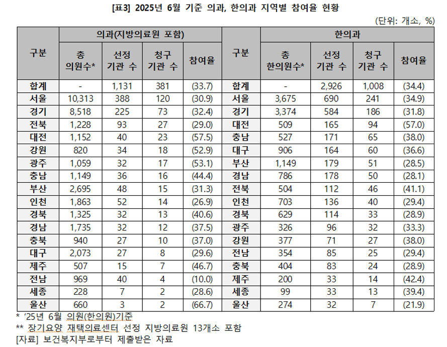 시범사업에 대한 지역별 참여율 격차도 컸다. 올해 6월 기준 의과(일부 지방의료원 포함)의 경우 울산(66.7%)이 가장 높았으며 이어 대전(57.5%), 광주(53.1%), 강원(52.9%) 순으로 참여율이 높았다 . 반면 전남(10%), 인천(26.9%), 세종(28.6%), 전북(29%) 순으로 참여율이 저조했다.