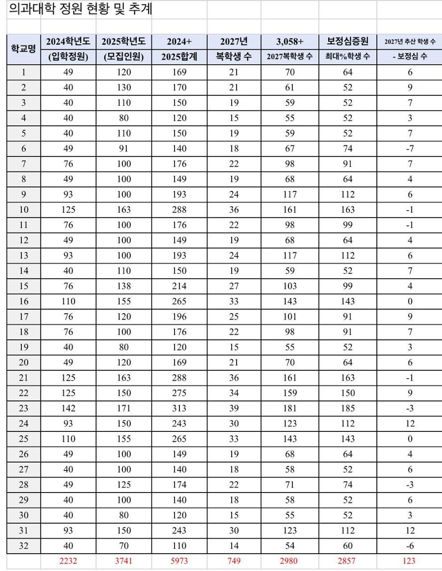 교수협은 "이 휴학생들이 2026년과 2027년에 50%씩 복귀한다고 가정해 2027년 32개 대학의 학생수를 추정하면 2027학년도 증원이 없는 상황에서도 이미 전체적으로 123명이 복지부에서 제시한 최대 증원 학생 규모를 초과하게 된다"고 지적했다.